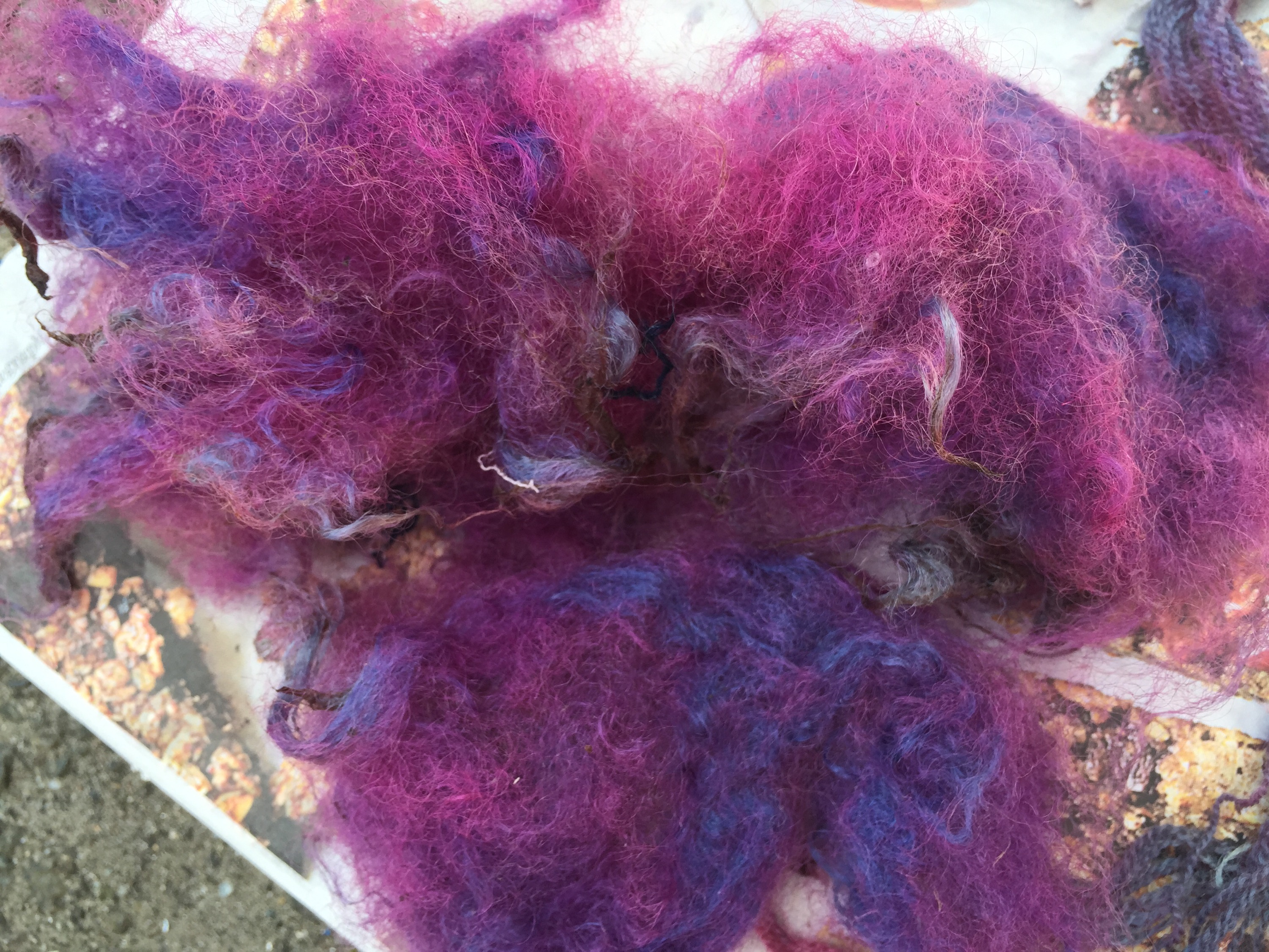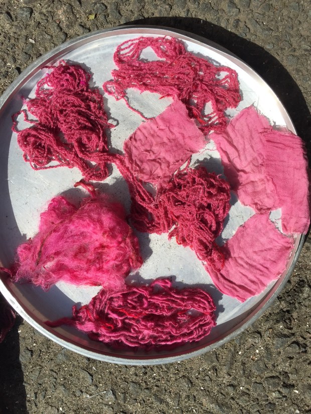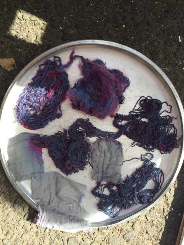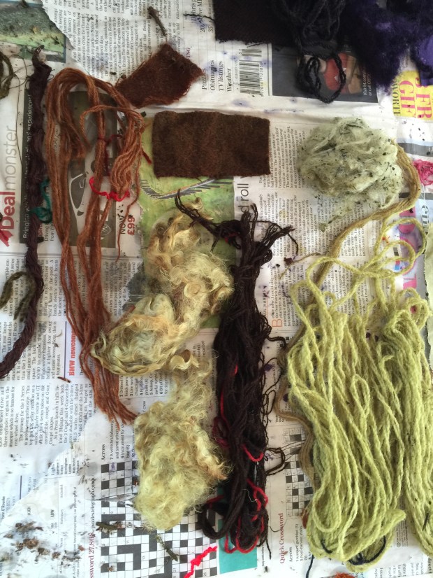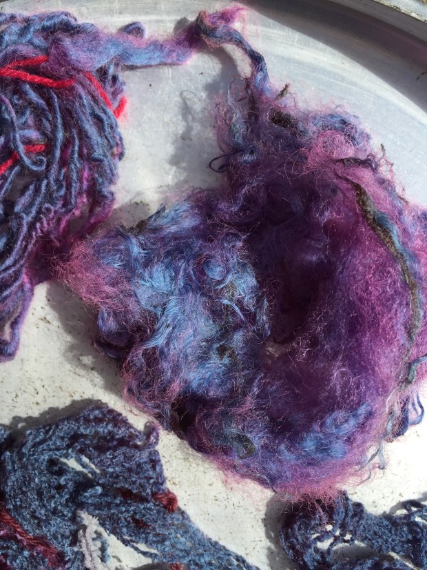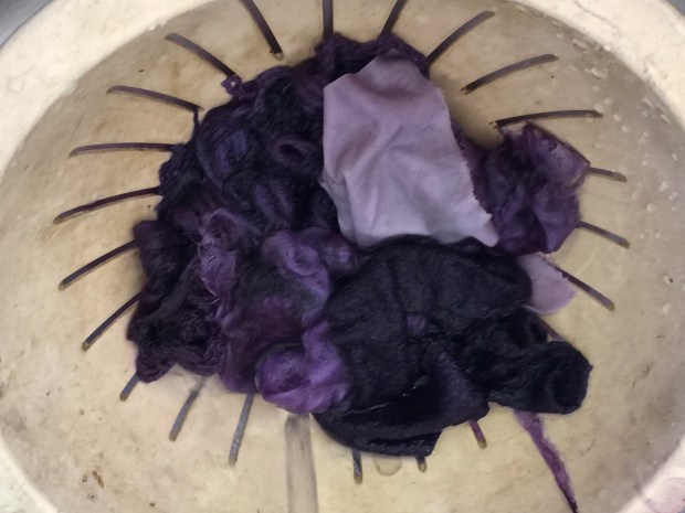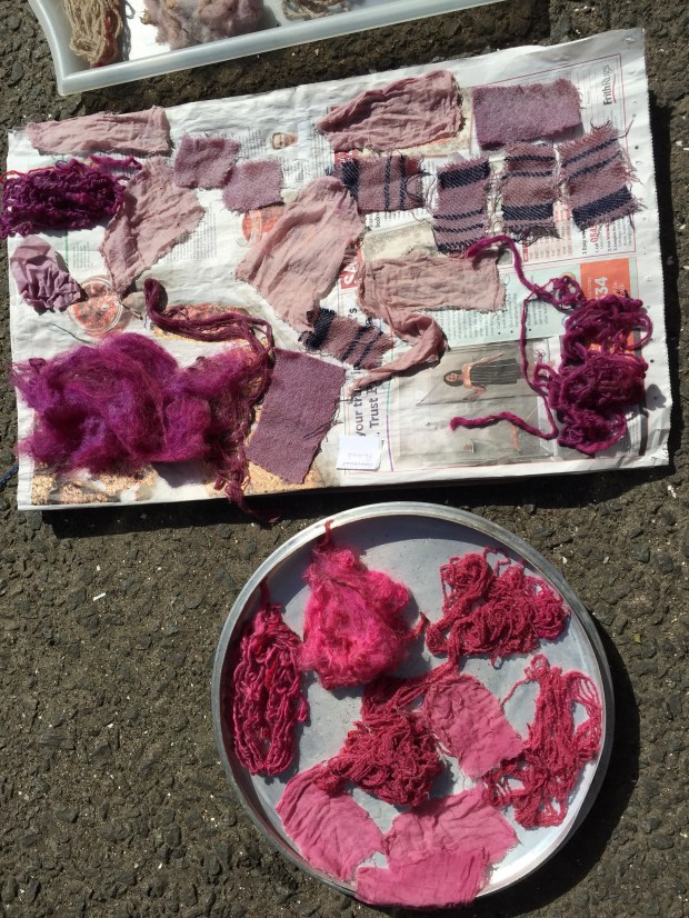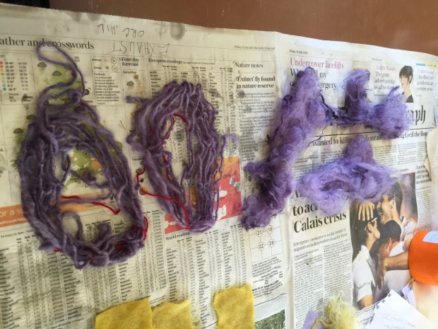 I am completely hooked on, this was definitely the most fascinating thing ever. The tutor Ann Ross, a felt maker has been dabbing at this for over 30 years, she just stick things in the pot and gives it a twist…. and they come back out pink, purple, green, yellow and blue. All this feels quite magical. All the colours of the rainbow as long as you use natural material. Who said Tweed had to be brown or drab green?