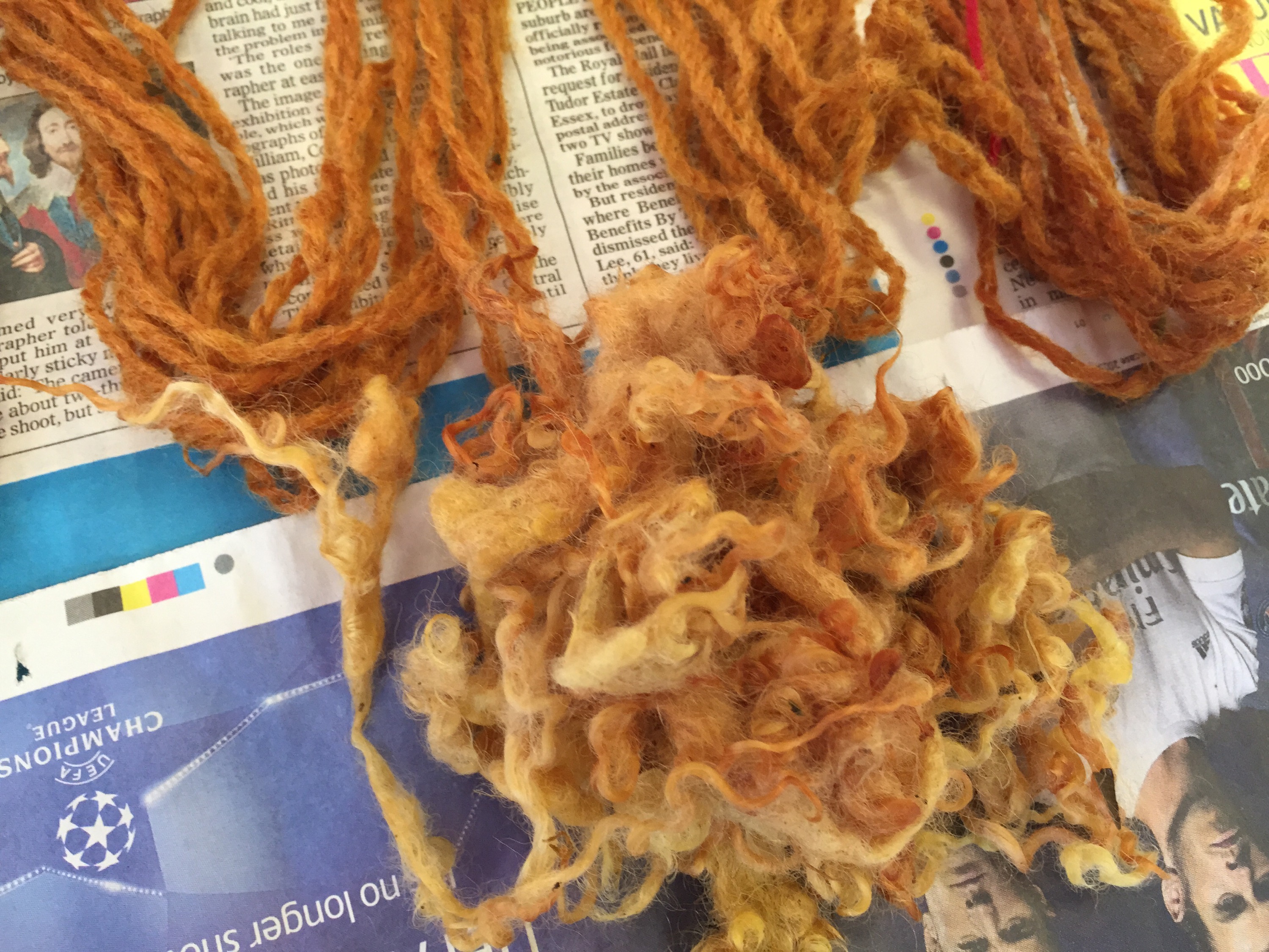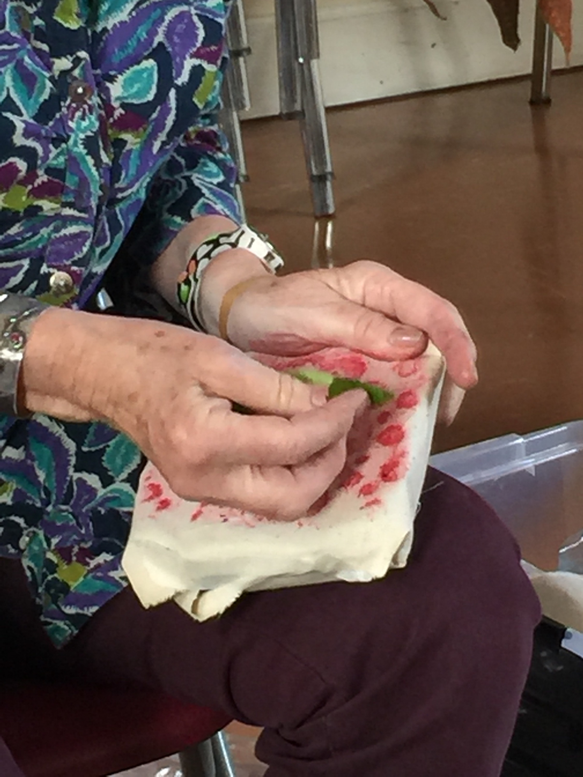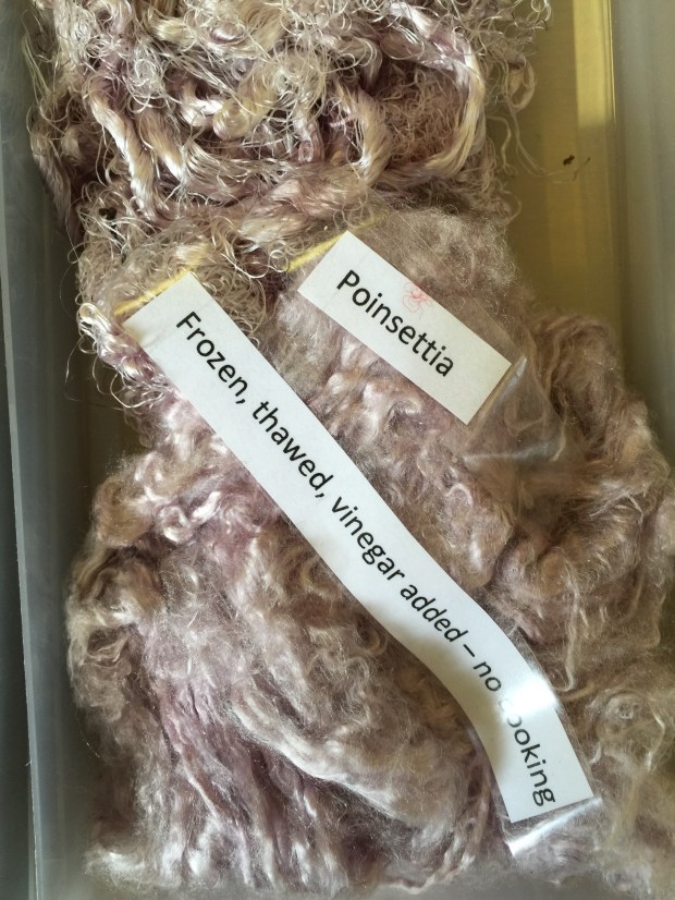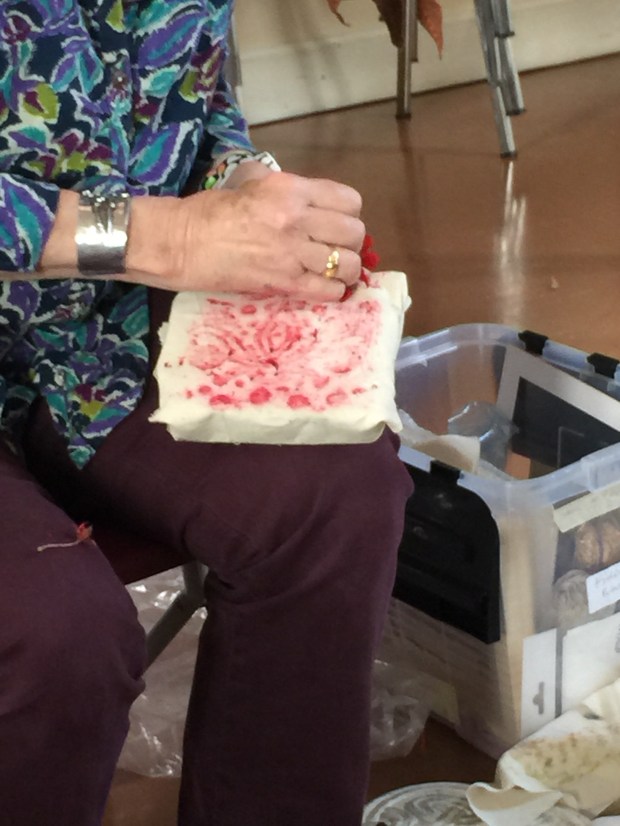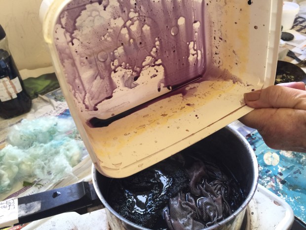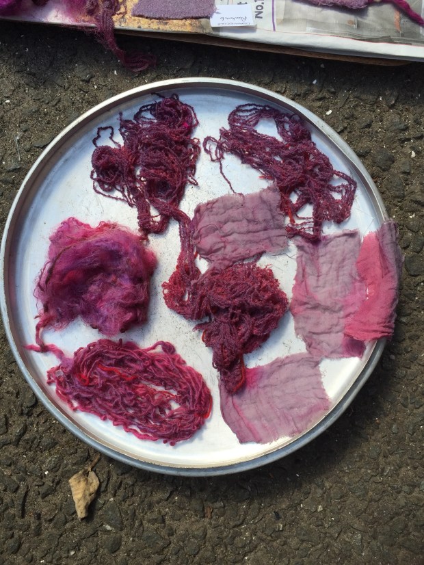 I am completely hooked on, this was definitely the most fascinating thing ever. The tutor Ann Ross, a felt maker has been dabbing at this for over 30 years, she just stick things in the pot and gives it a twist…. and they come back out pink, purple, green, yellow and blue. All this feels quite magical. All the colours of the rainbow as long as you use natural material. Who said Tweed had to be brown or drab green?