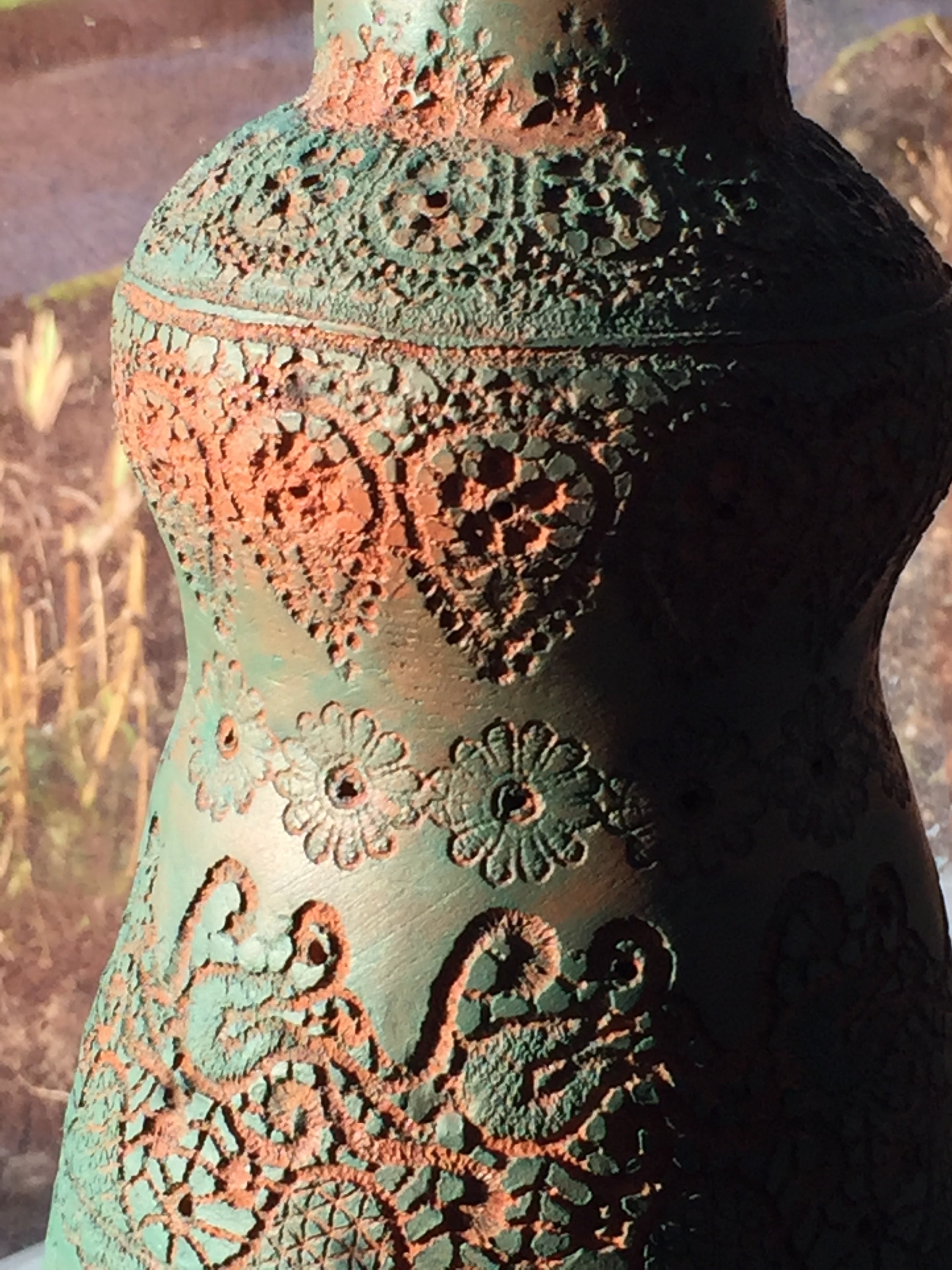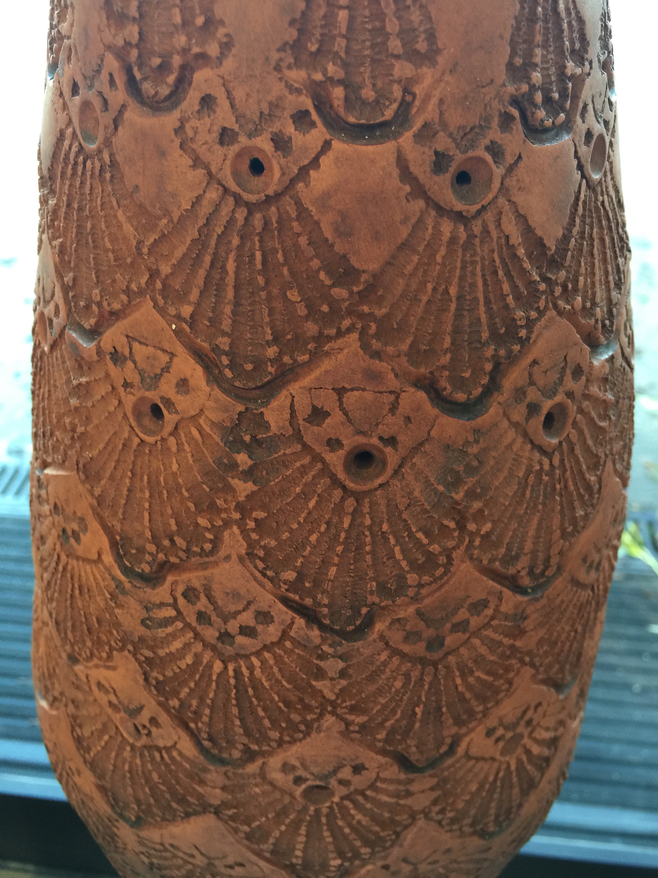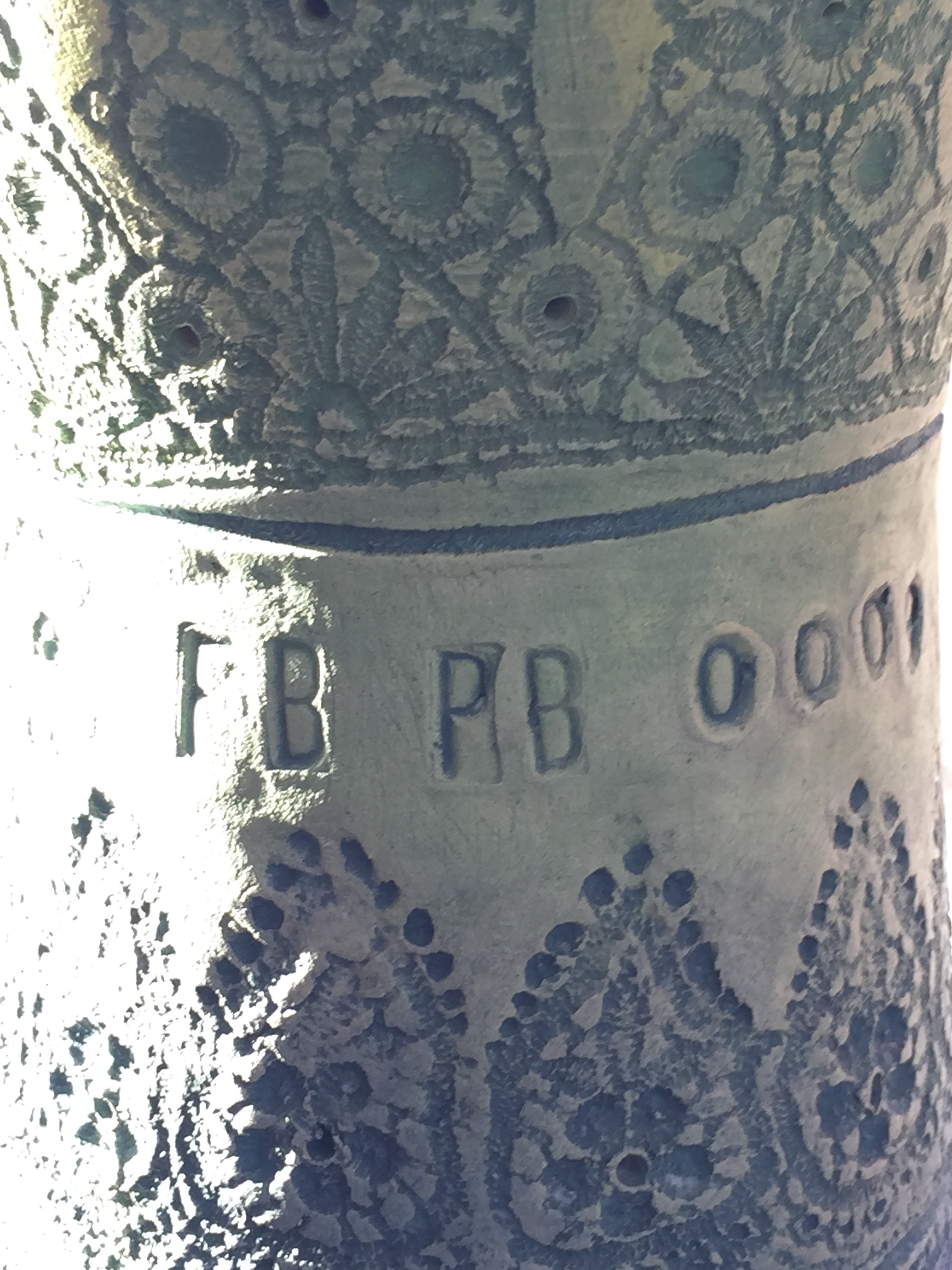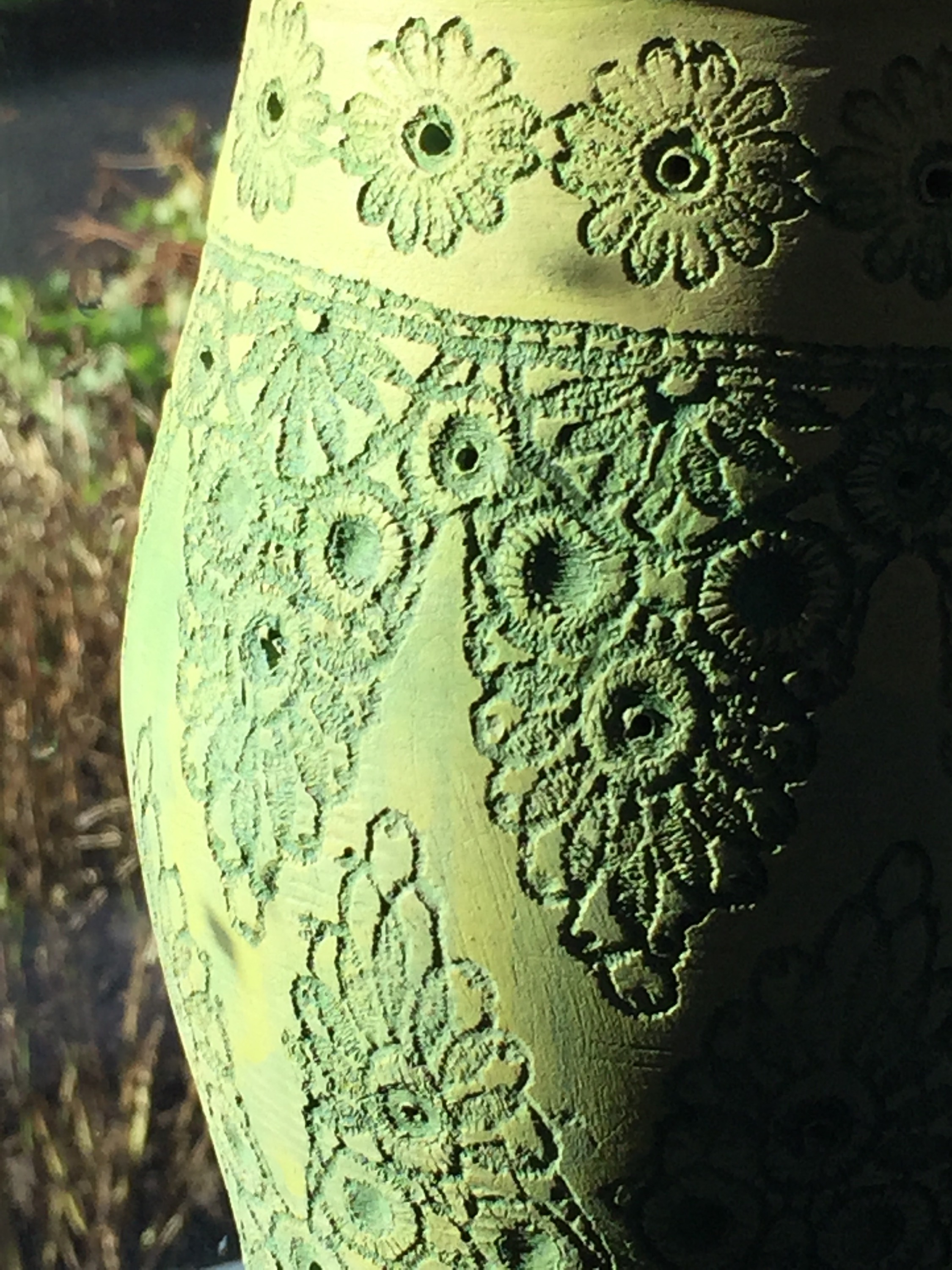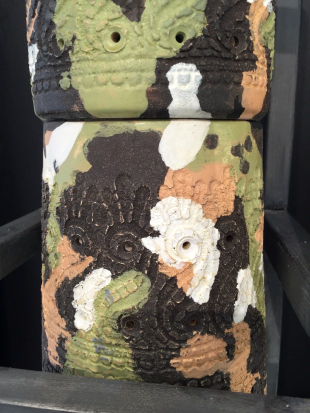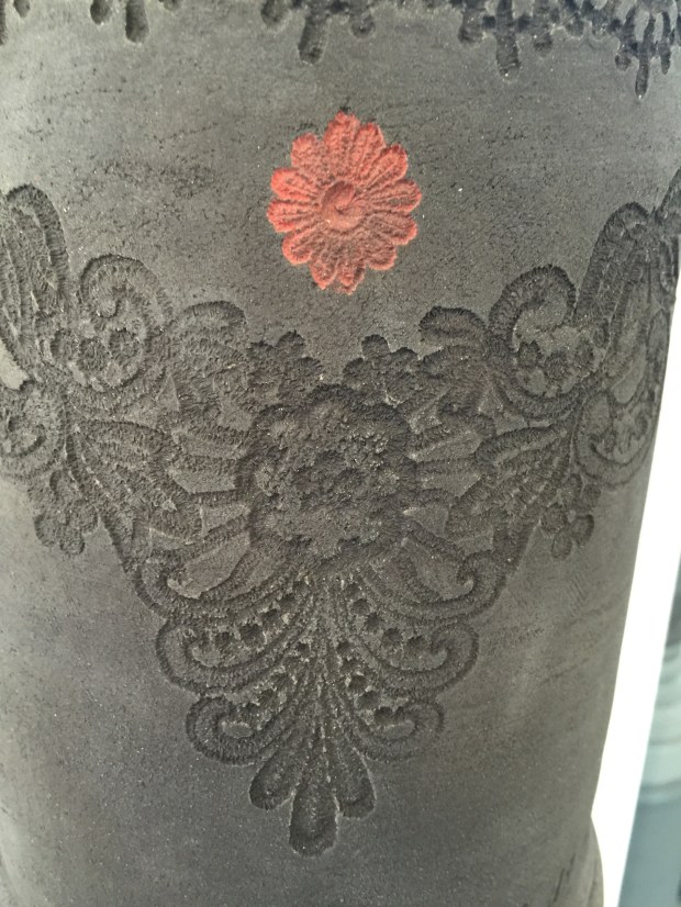 From a bomb they only have the shape, they are made of clay and are entirely covered with surface decoration, repeated patterns imprinted in the clay before it is fired. A low surface decoration, paisley patterns, small geometrical flowers, palmettos and others repeated in a neatly fashion like if Peter had crocheted a cover for his bombs. I guess when happy with the surface he coloured them in bright colours and created a toping for each of them… big bright flowers !